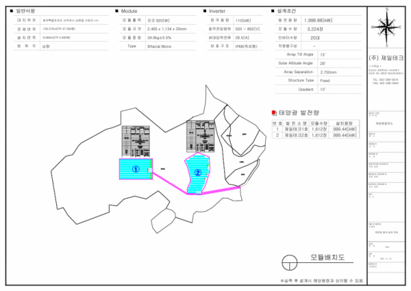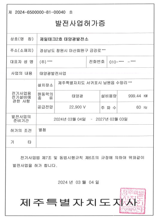 제일테크 2호 (주)제일테크 | 2024-11-22 소재지 주소 제주도 서귀포시 남원읍 수망리 준공연월일 개발행위 완료 / PPA 접수완료 KW 1(MW) 매매형태 현물 매매가격 미정 사업구분 법인 소유구분 임대 발전사업허가일 2024.03.04 개발행위 허가일 2024.02.16 PPA 접수일 2024.03.08 진행률 공사계획중 전체 설치용량 1(MW) 본문 이전글제일테크 3호 2024-11-22 다음글제일테크 1호 2024-11-22 목록 목록 답변